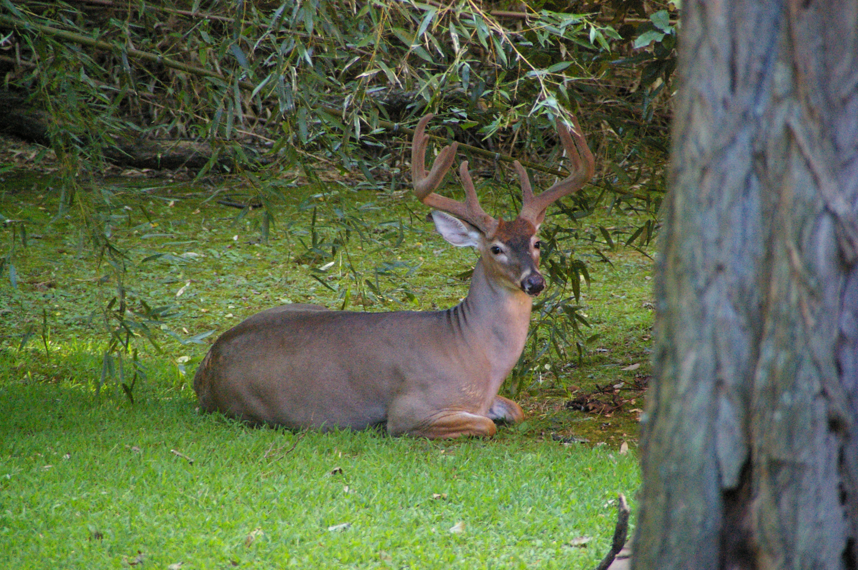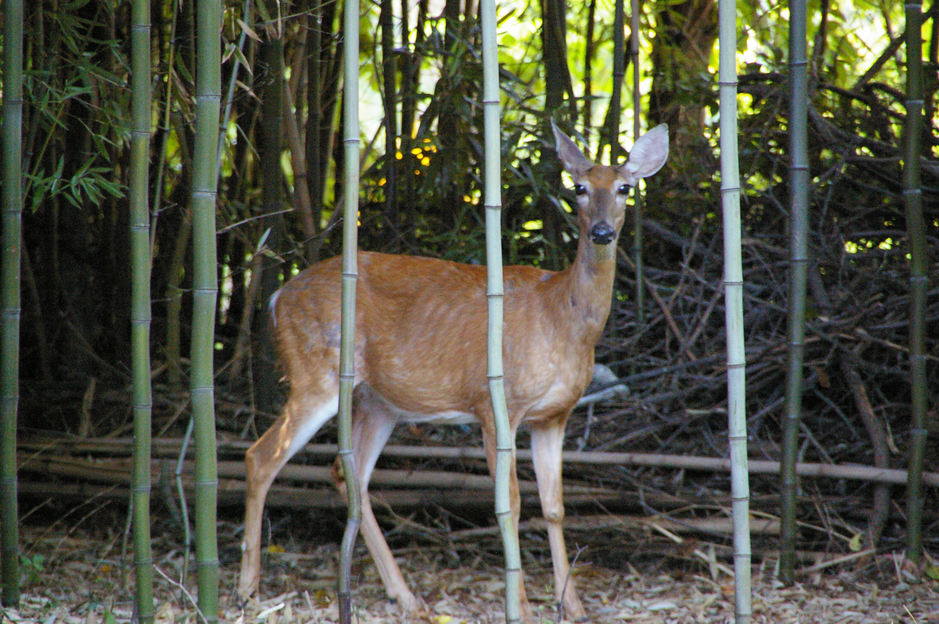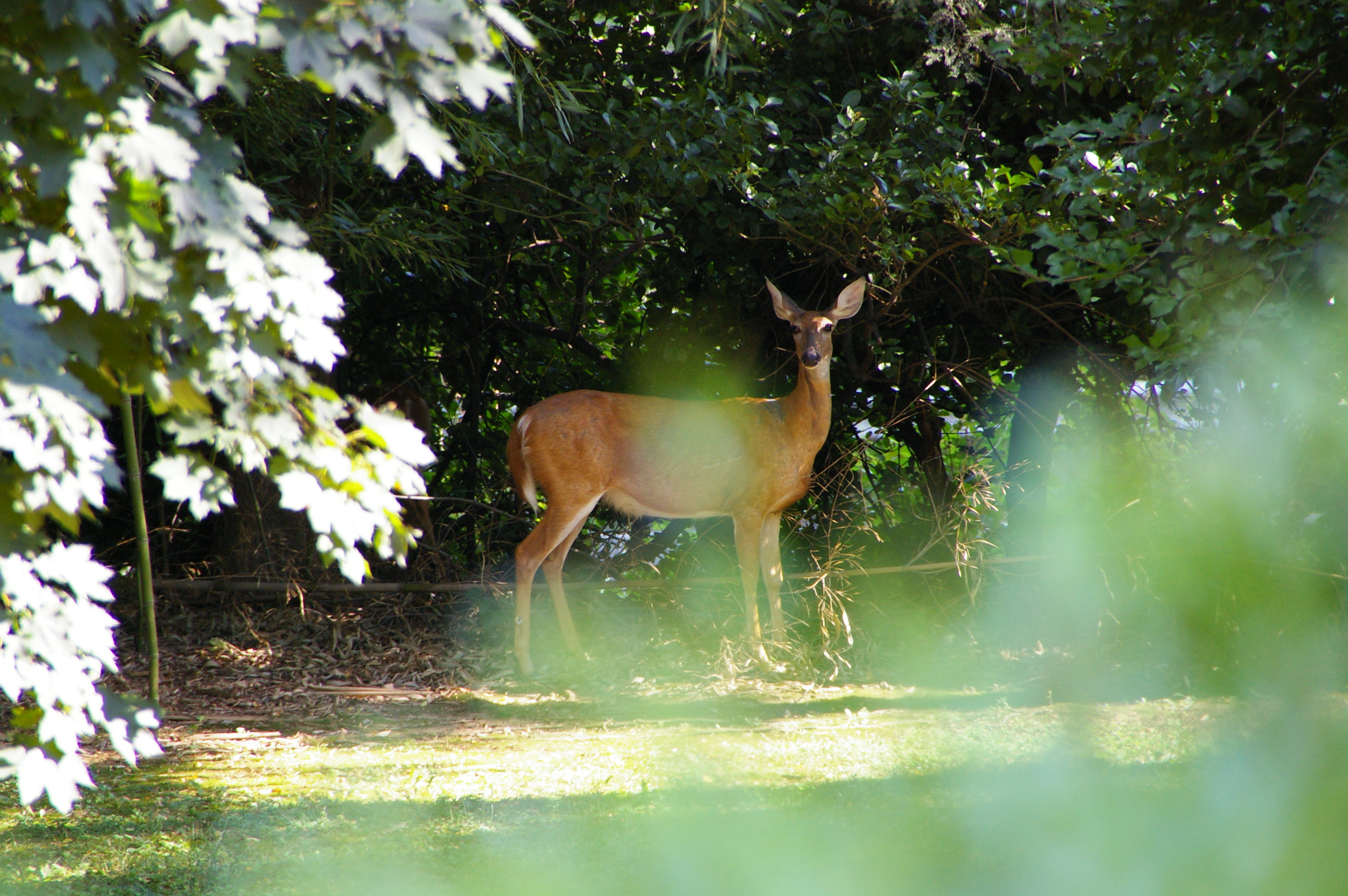 浣熊和鸟儿成了Jim 和我的最爱,大黄却只对梅花鹿感兴趣。这个鹿家庭至少有四个个成员,在鹿爸爸的带领下,游走于后院和邻院之间。今春,又添了一个小宝宝。这是我第一次看到鹿宝宝,它的体型还不及大黄,瘦瘦的,满身斑点,黄白相间,紧紧的粘在母鹿身旁,一双眼睛稚气灵秀,极易受惊的模样。鹿群不但爱桑椹,还喜欢亚洲梨,扬起头来,把个个还没成熟的梨子啃啮一半,就扔下不管。他们是大黄的死敌,睡塌之旁岂容他人鼾息?大黄虽誓师捍卫疆土,可隔着阳光屋的落地玻璃窗,鹿群并不很在意,反而悠然自得,闲闲地看着大黄。大黄只能在外出如厕时,亦步亦趋,嗅者鹿群的体味,洒一泡尿,算是得到“精神的勝利”。